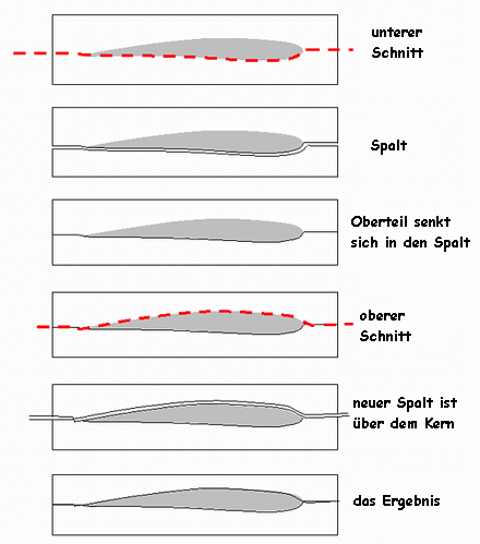 unterlegt werden. Beim Schneiden geht man genauso vor wie beim Unterzug. Wenn das fertig ist, wird wieder abgerippt und die Gewichte vom Styropor entfernt. Normalerweise sollten sich die Schalen gut vom Kern lösen. Bei EPP verklebt das alles immer ein bisschen. Beim Trennen von Schale und Kern muss man aufpassen, die empfindliche dünne Endleiste der Kerne nicht zu beschädigen. Wenn man sorgfältig gearbeitet hat und auf einen gleichmässigen Drahtvorschub beim Schneiden geachtet hat, sollten die Oberflächen des Kerns absolut eben und gleichmässig sein. Kleineren Unsauberkeiten kann man natürlich mit einem Schleifklotz begegnen. Bei wirklich schlimmen Riefen sollte man den Kern besser nochmal schneiden. Das ist auch der Grund, weshalb man erstmal ein bisschen mit billigem Baumarktstyropor experimentieren sollte, bevor man die teuer erstandene EPP- Platte verschandelt. Übung macht schliesslich den Meister. Und die vom Team produzierten Kerne haben praktisch CNC- Qualität. Formvergleiche mit einer ausgedruckten Profilkontur ergaben an der Oberseite keine sichtbaren Abweichungen, und Abweichengen auf der Unterseite waren nur in einem kleinen Bereich vorhenden und deutlich kleiner als 0.2mm. Das kann durch zufällige Fehler wie Unebenheiten der Tischplatte oder ungleichmässigen Vorschub entstanden sein, auf jeden Fall spielen solche Fehler keine Rolle. |