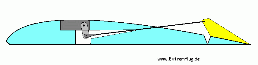| In Verbindung mit den Ruderhörnern für Leicht- EPPs wurde diese Anlenkungstechnik entwickelt. Wichtig hierbei ist, dass das Ruderhorn nur sehr wenig über die Profilkontur herausragt. Dies ist z.B. bei ins Profil integrierten Rudern der Fall, da diese an der Scharnierlinie schon recht dick sind, und somit die Ruderoberseite schon einen gewissen natürlichen Abstand von der Scharnierkante hat. Der Anlenkungspunkt im Ruderhorn bedarf deshalb keines großen Abstandes zur Ruderoberseite, um einen guten Hebelarm zu haben. Die Servos werden von unten in die Fläche eingesetzt. | ||||||||||||||||||||||||||||||||||||||||